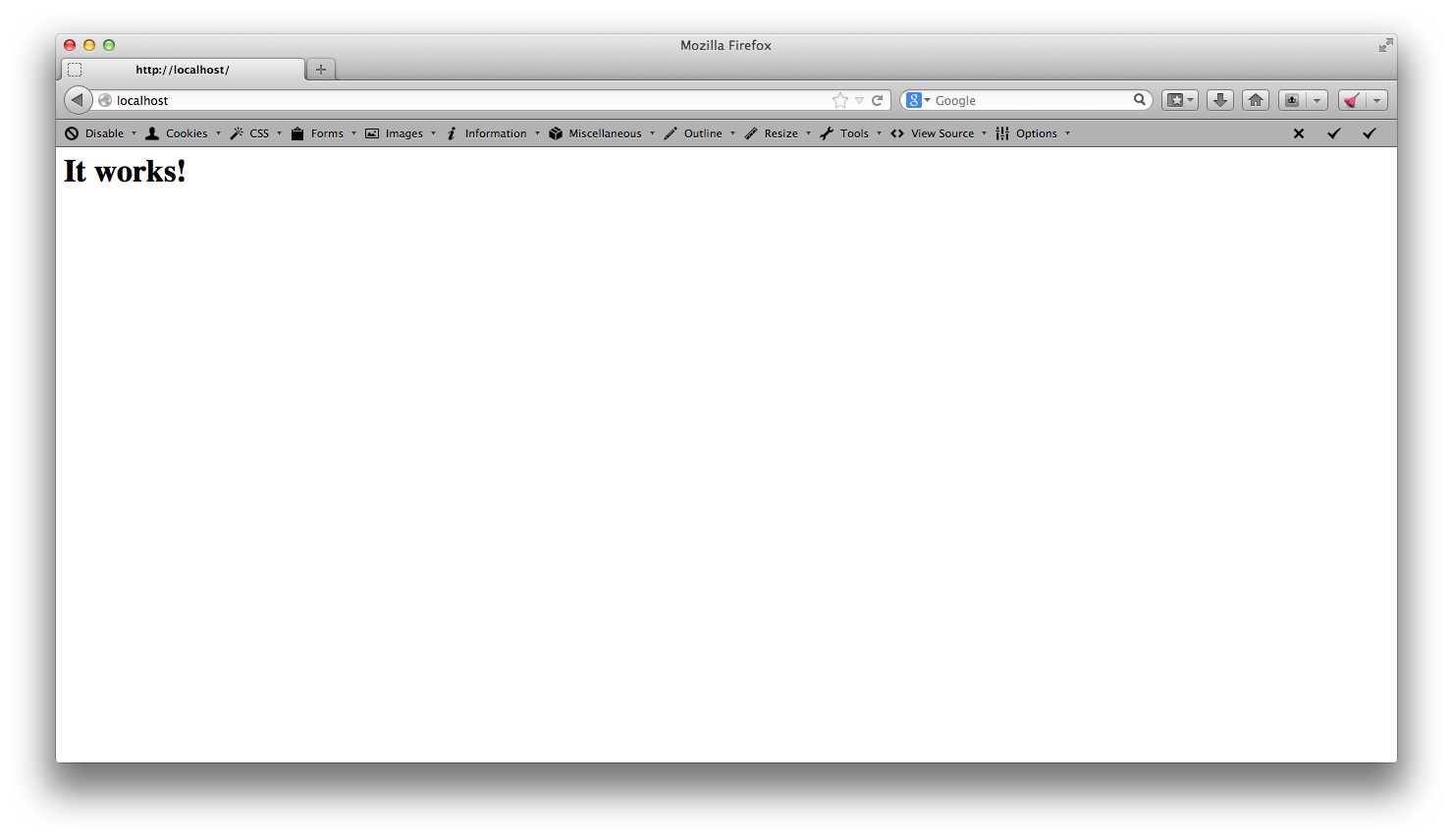 To ensure the server works, start it, per the instructions above, then open a browser and point it at localhost. The browser should read, It Works!: