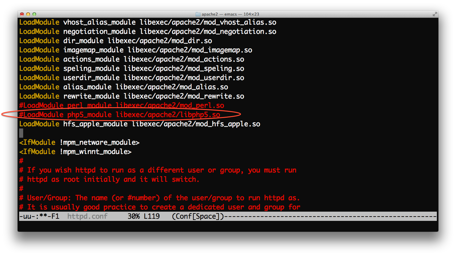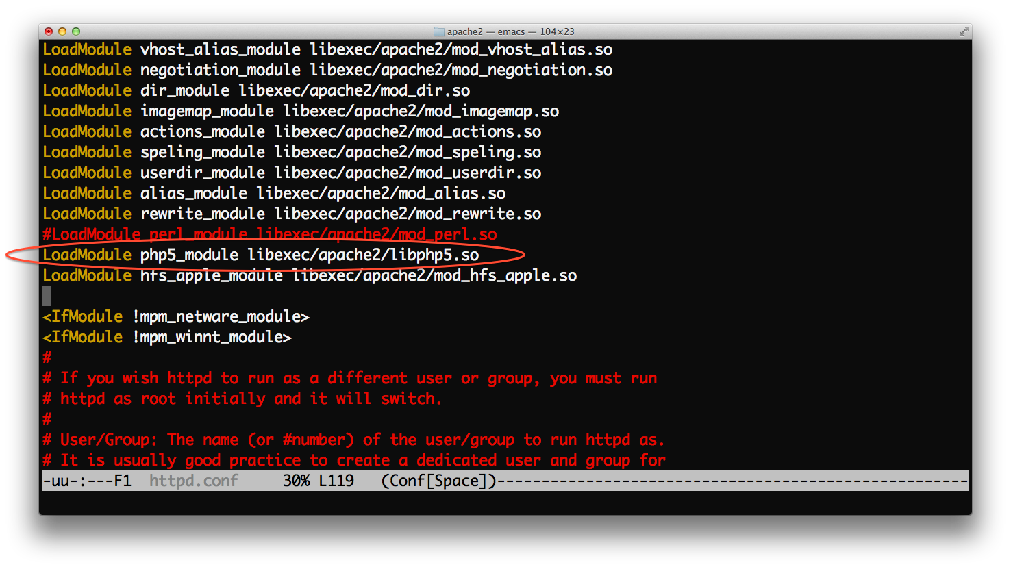 - The HTTP configuration file for the Apache server — httpd.conf — is inside the apache2 folder. A small change needs to be made to this file for PHP to work, and we’ll use emacs to make the change. (You’ll be asked for the root password in this step.)