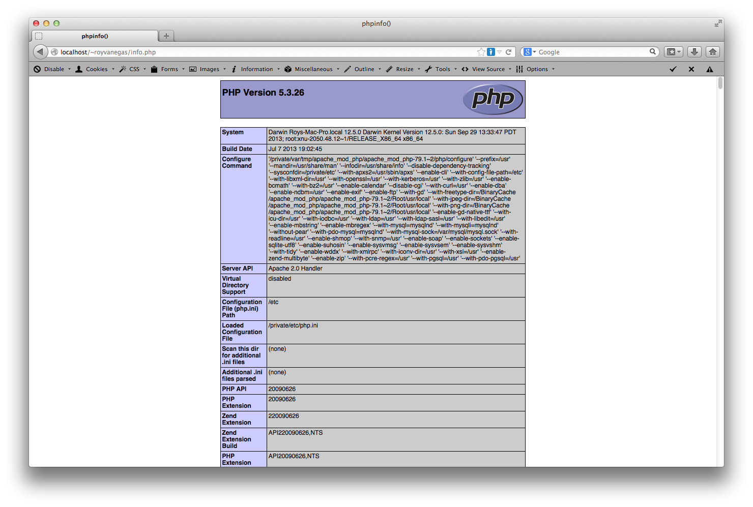 - Open a browser and point it at localhost/~YOUR_USER_NAME/info.php, where YOUR_USER_NAME is your Mac username. If you don’t know it, type whoami at The Terminal.
