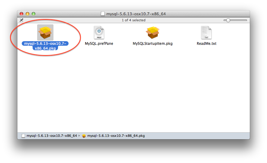 Figure 2: Placing focus on the mysql-5.6.13-osx10.7-x86_64.pkg file. - Launch The Terminal.