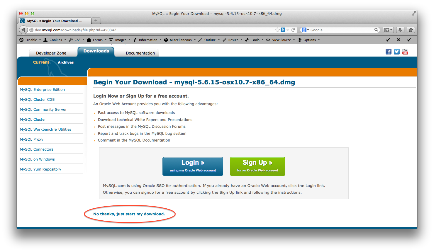 - You don’t need to open an account at Oracle to download MySQL. Click “No thanks, just start my download” to continue.